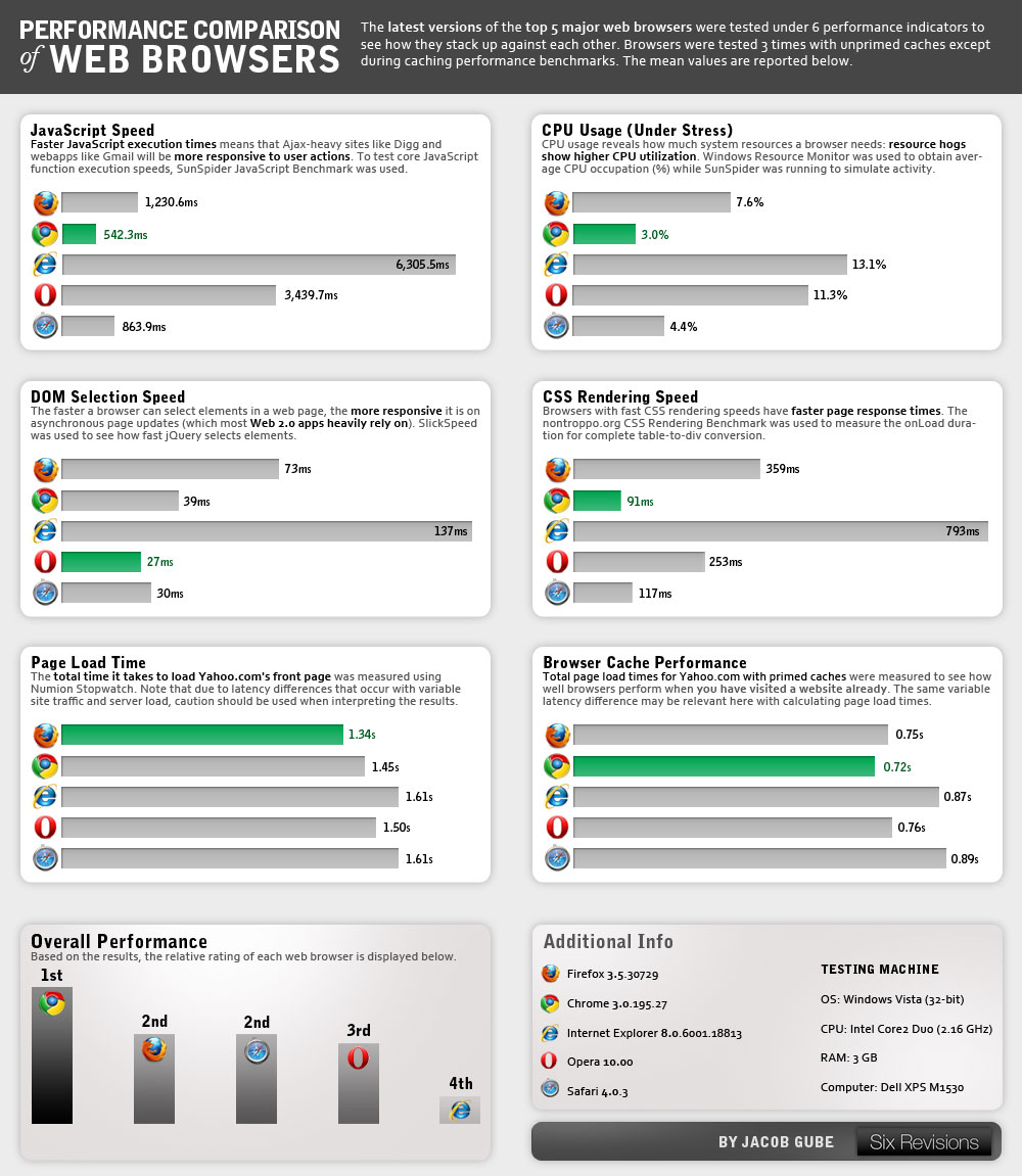En SixRevisions han realizado una comparativa entre las últimas versiones de los navegadores más usados del momento: