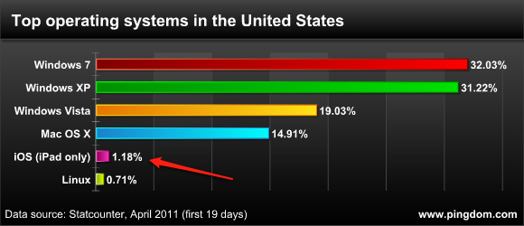 Según un estudio de Royal Pingdom(sí, ese sitio que le encanta publicar gráficos), el sistema operativo (SO) del ipad es más utilizado que linux en los Estados Unidos (1.18% vs 0.71%).
