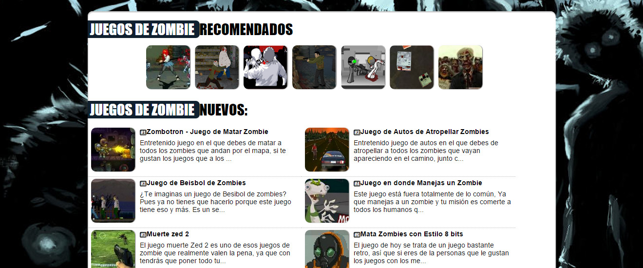 ¿Te gustan los juegos de zombie? ¿O mejor todavía te gustan los zombies? Pues a mí me encantan, es por eso que el mismo script desarrollado anteriormente con algunas pequeñas modificaciones se convirtió en este entretenido sitio que recopila los mejores juegos de zombies del mercado de los juegos casuales, el sitio en sí es muy pero muy sencillo, pero creo que cumple con su función que es entretener. El sitio actualmente se encuentra abandonado pero todavía recibe visitas regulares, por lo que difícilmente será dado de baja.